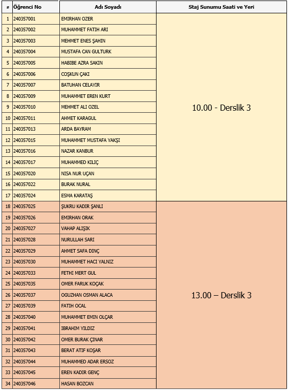 Raylı Sistemler Makinistlik Programı staj sunumları 05.01.2026 Pazartesi günü belirtilen listeye göre yapılacaktır.